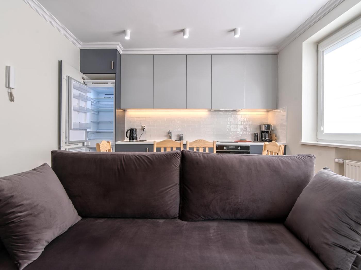 Oferta apartamentu obejmuje sypialnię (1), salon, kuchnię z pełnym wyposażeniem, w tym lodówką i ekspresem do kawy, a także łazienkę (1) z prysznicem oraz bezpłatnym zestawem kosmetyków. W apartamencie zapewniono ręczniki i pościel.